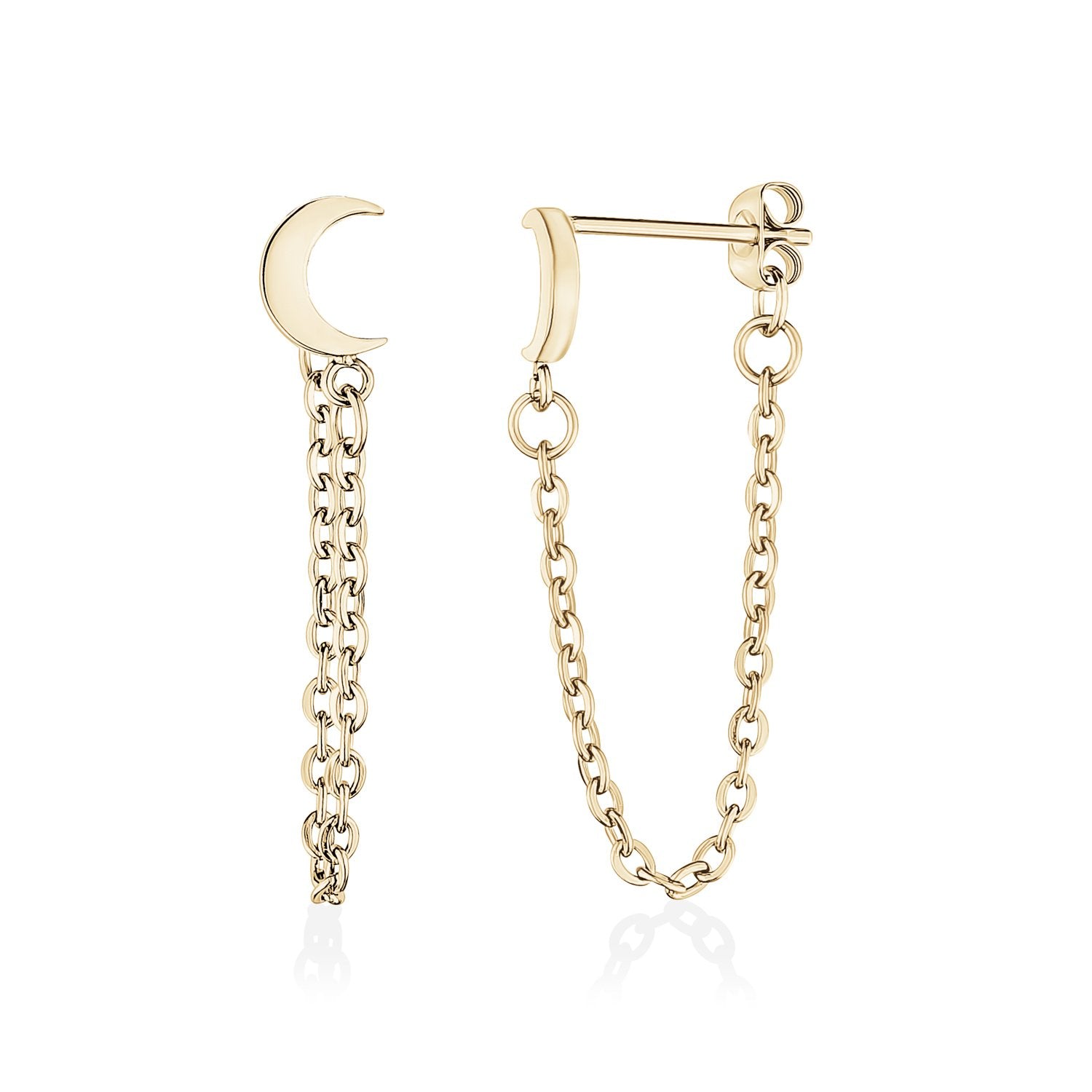 Unieke halve maan oorbellen voor dames met een hangende roestvrijstalen kettingverbinding.