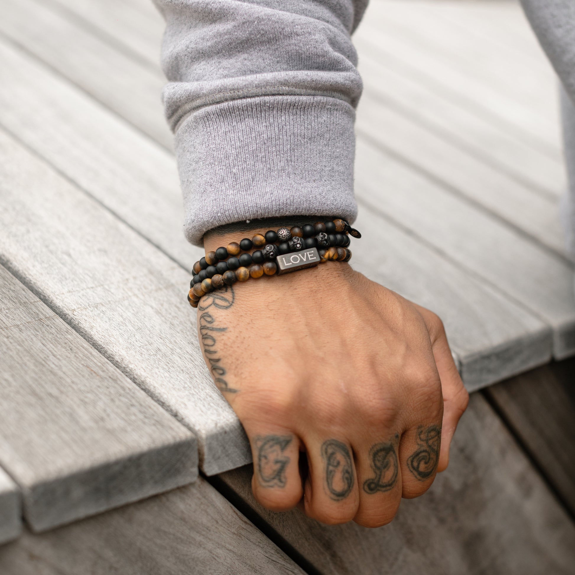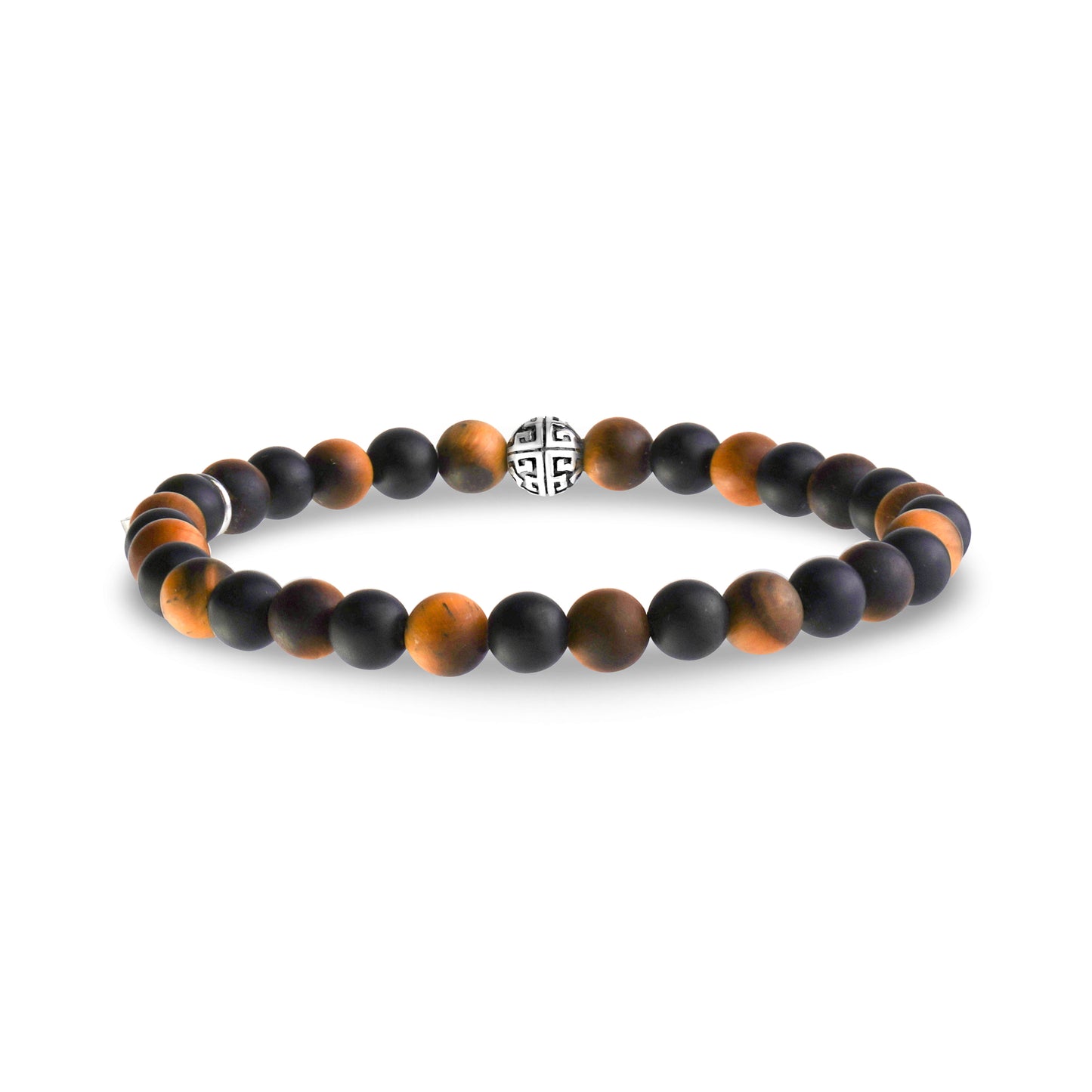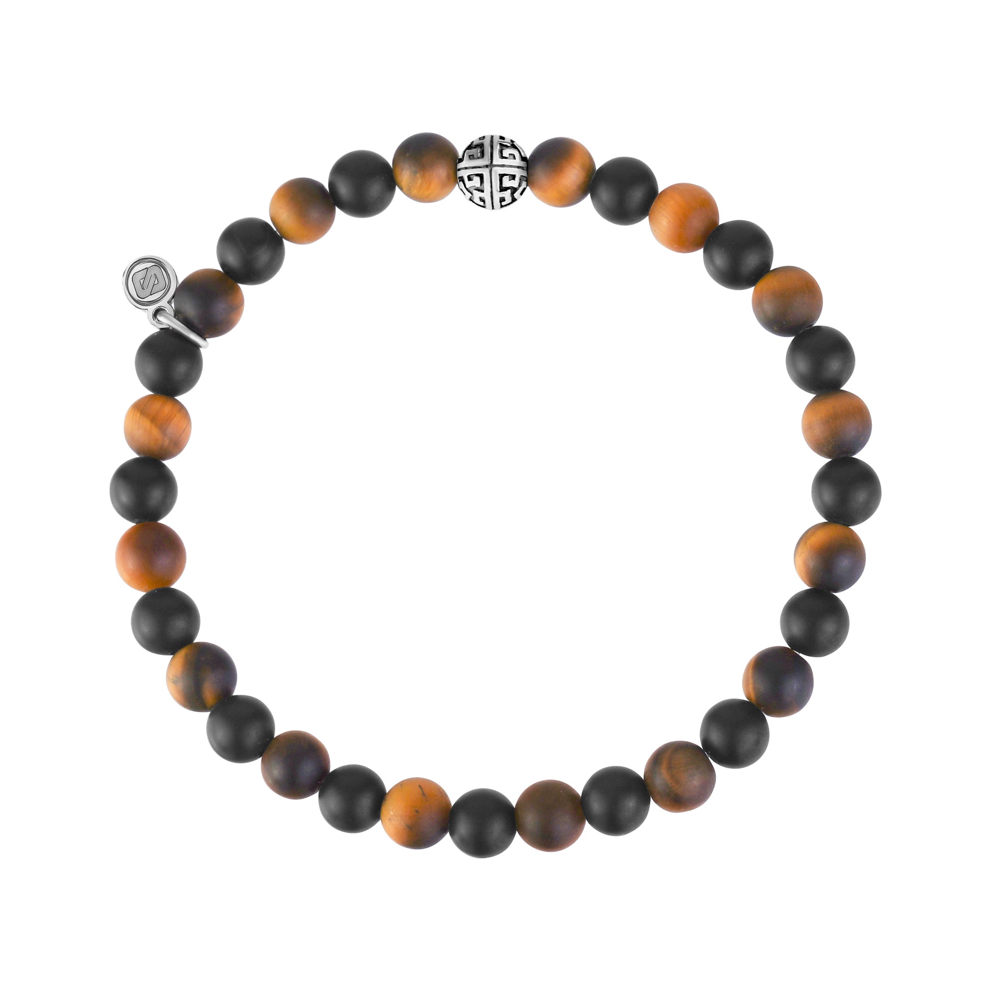 Gemaakt van 6 mm mat zwarte onyx en mat bruine tijgeroog kralen, combineert deze armband kracht en focus in één gedurfd stuk. Zwarte onyx biedt aardingsenergie, terwijl tijgeroog zelfvertrouwen en helderheid bevordert. Afgewerkt met onze kenmerkende roestvrijstalen kraal en een sterk elastisch koord is hij gemaakt om te stapelen, cadeau te geven of om alleen te dragen.