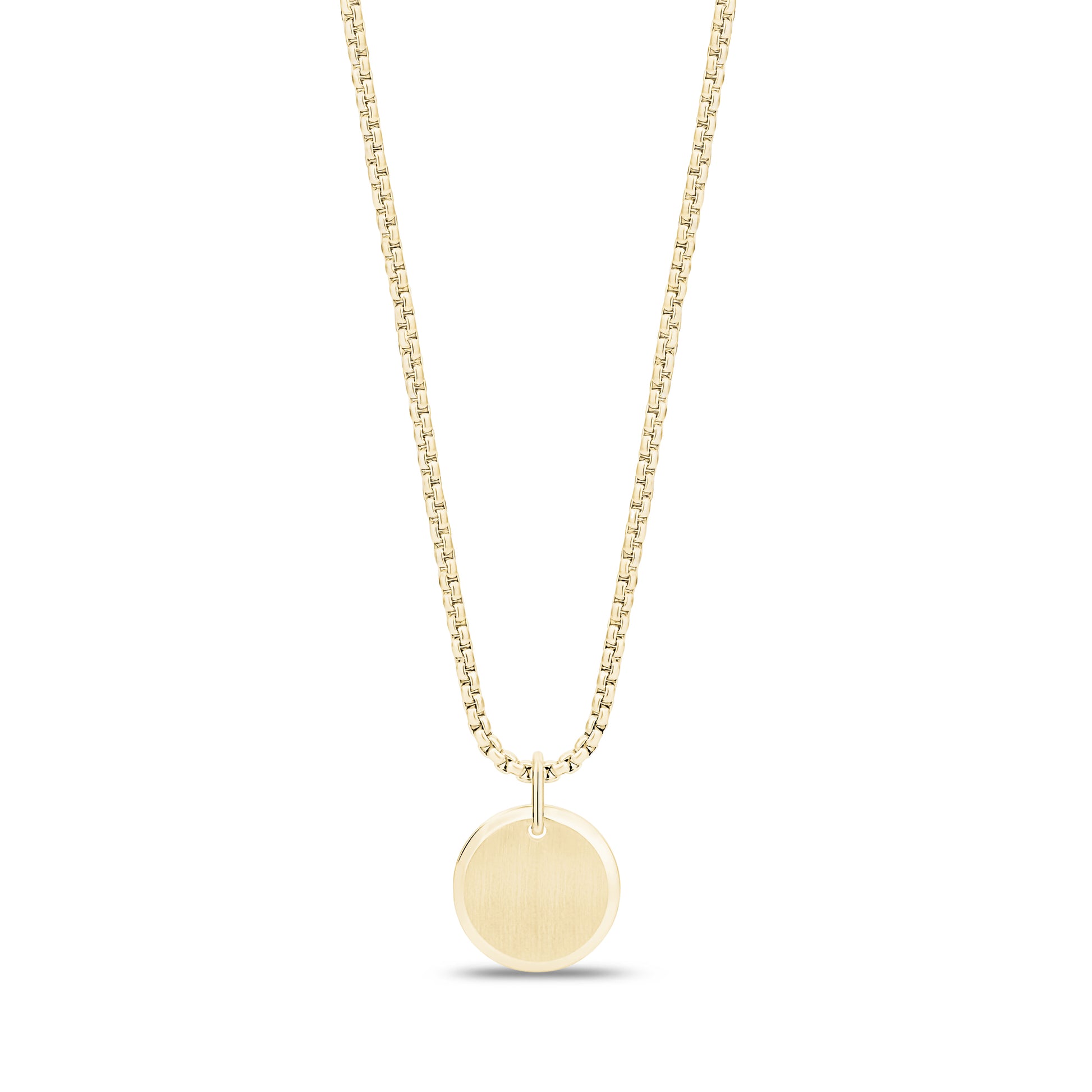Laat je stijl zelfverzekerd spreken. Deze ronde hanger van 16 mm (0,63") heeft een afgeschuinde rand, een mat midden en een gepolijste buitenring voor een strak, modern contrast. Hij kan aan beide kanten worden gegraveerd en is perfect om een naam, datum of boodschap toe te voegen die er toe doet. Wordt geleverd met een ronde boxketting van 2 mm (0,08"). Een gedurfd, persoonlijk cadeau voor mannen en een alledaags sieraad met betekenis.