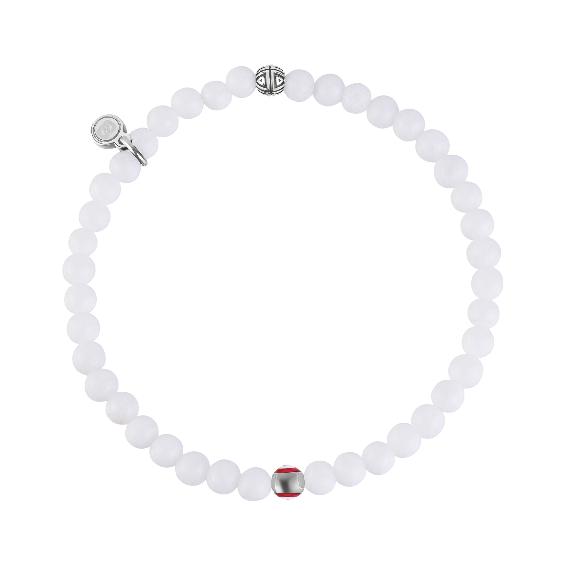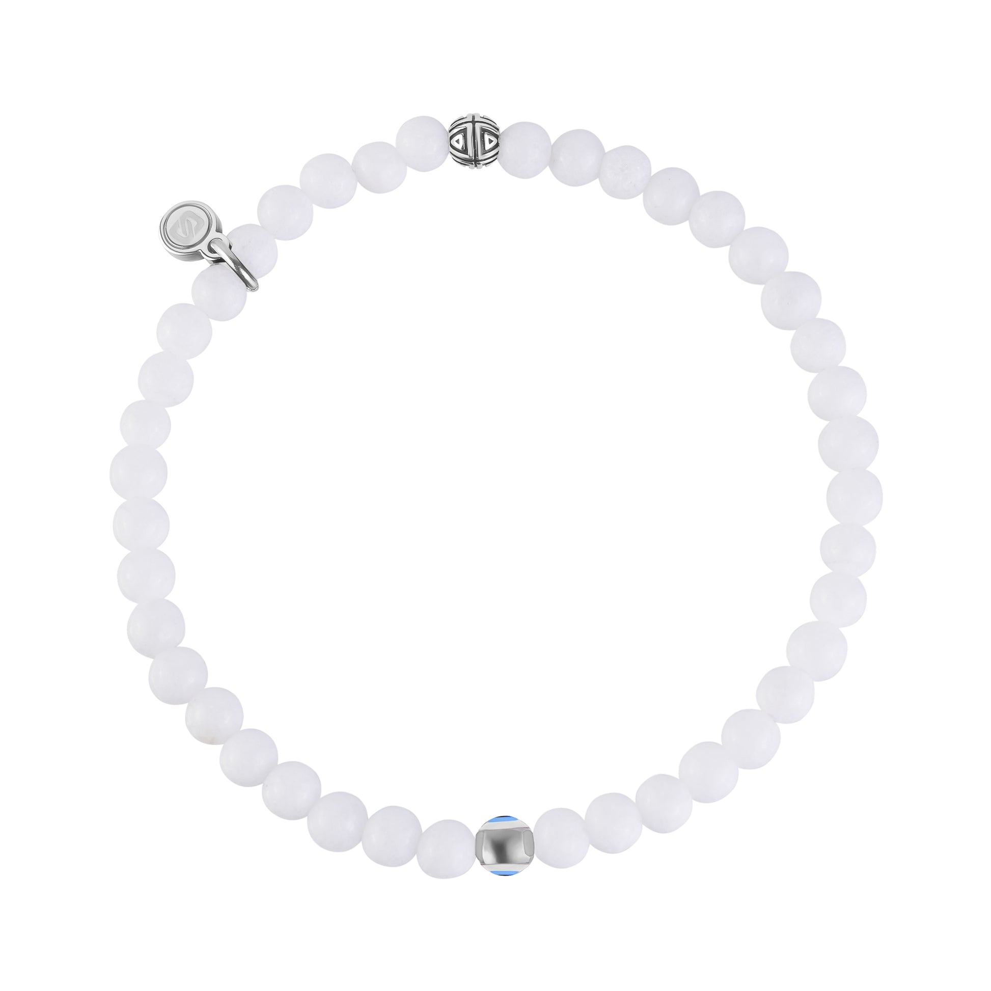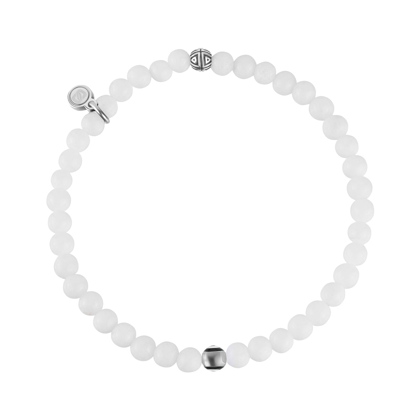 Een moderne upgrade van een tijdloos symbool. Deze armband is gemaakt van 4 mm (0,16") witte jade kralen, die bekend staan om het brengen van vrede, helderheid en positieve energie. Hij is voorzien van onze verbeterde boze oogkraal, nu verbeterd met een gepolijste roestvrijstalen omtrek voor een verfijnde, hoogwaardige afwerking. Het boze oog wordt al eeuwenlang gedragen als bescherming tegen negativiteit en voegt een krachtige betekenis toe aan een armband die stijlvol en symbolisch is en perfect om te stapelen of cadeau te geven.